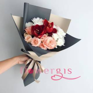 Микс из сортовых хризантем, выглядит как оригинальное воздушное послание для дорогого сердцу человека. В букете собраны крупные цветки белого, желтого и фиолетового цвета с декором из блестящей тонкой фольги золотистого и бордового оттенка. Букетик выглядит ярко, навевает радостные эмоции, а ажурный топпер укажет, кому именно предназначен букет.